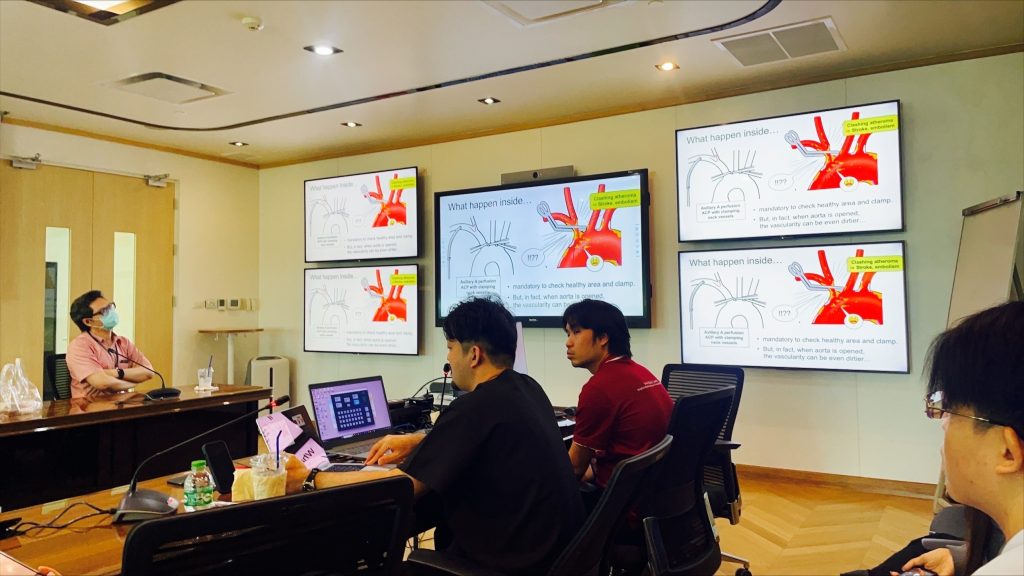 脳保護の方法が確立され、世界中でシェアされているにも関わらず、施設によって脳梗塞の発症率に差があります。それは頸部分枝をダイレクトにつかまないといった細かいハンドリングや、丁寧なトリミングの仕方、flowの細かいcontrolなど、我々が当たり前にやっているけれど、教科書や論文には書かれていない部分の違いではないかと思います。まさにon-siteでKawasaki styleを広める意味はここにあるなと感じました。