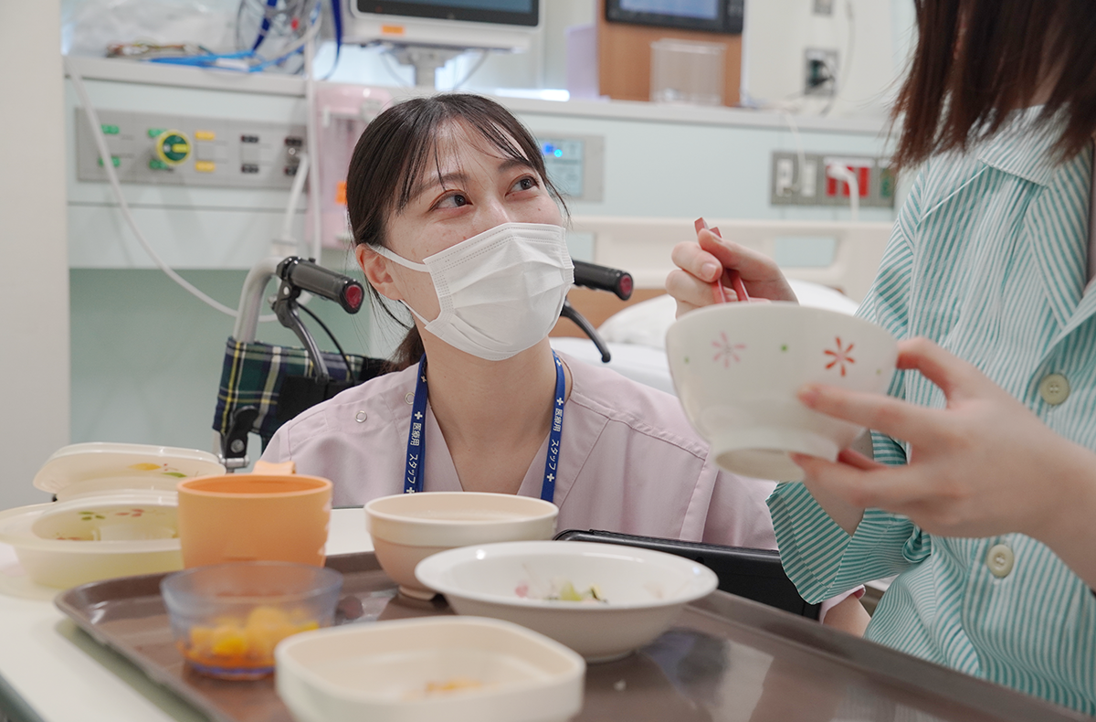 患者さんの食事摂取状況を確認します。摂取量が少ない患者さんには医師や看護師、言語聴覚士と相談しながら食事内容を調整しています。